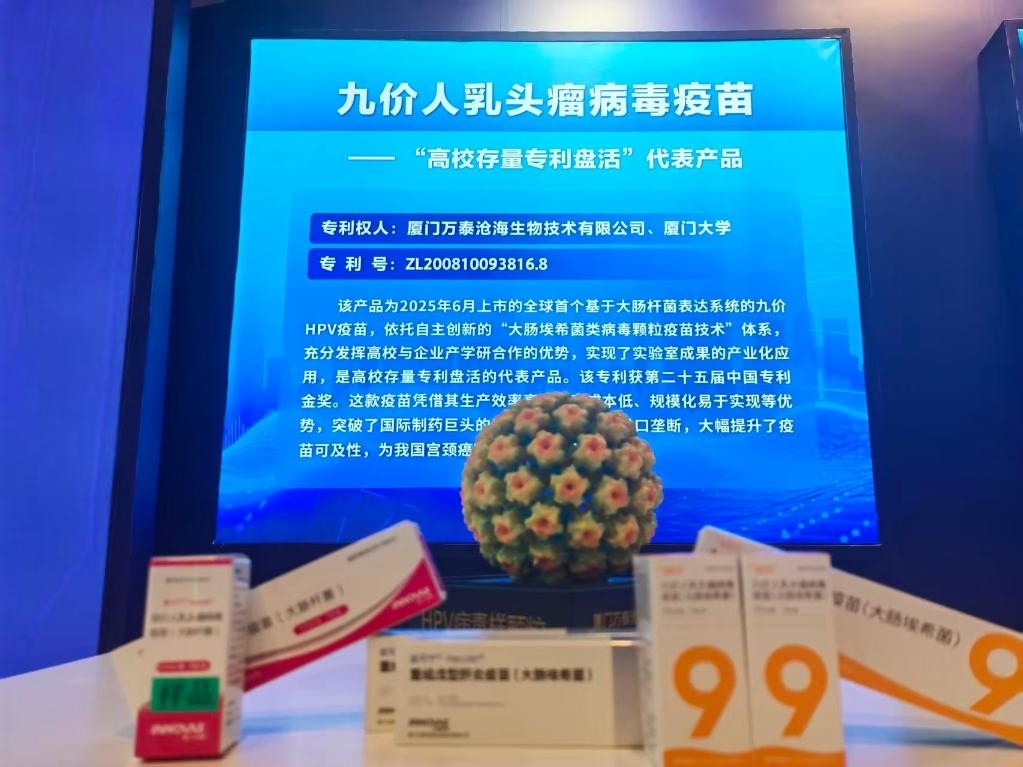 在第十四屆中國國際專利技術(shù)與產(chǎn)品交易會上展出的九價(jià)人乳頭瘤病毒疫苗。新華社記者徐鵬航 攝