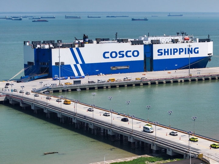 2025年9月16日,在江蘇太倉港,裝載3600余輛商品車的“玉衡先鋒”號即將啟程前往東南亞(無人機照片)。新華社記者 李博 攝