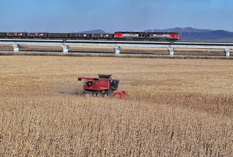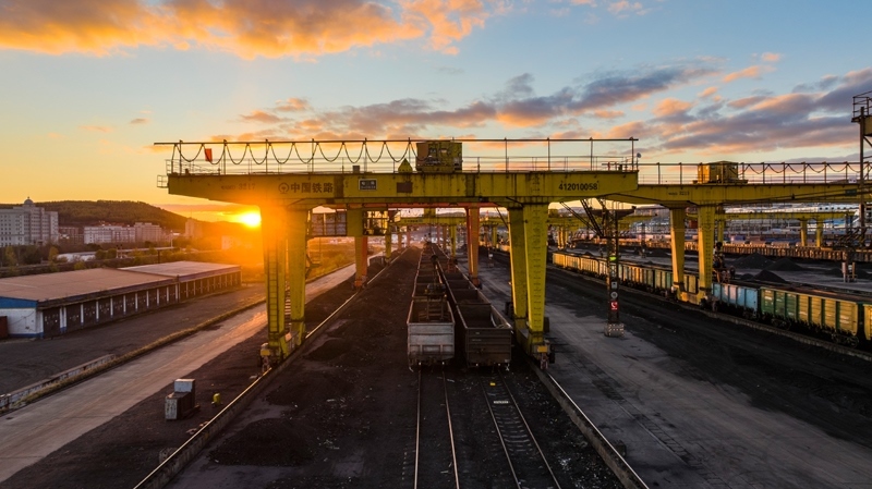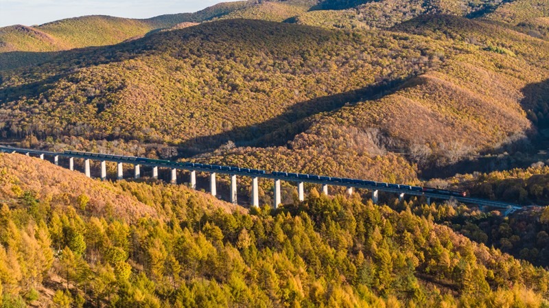 10月18日,一列滿載進口物資的貨物列車駛向中國鐵路哈爾濱局集團有限公司綏芬河站(無人機照片)。