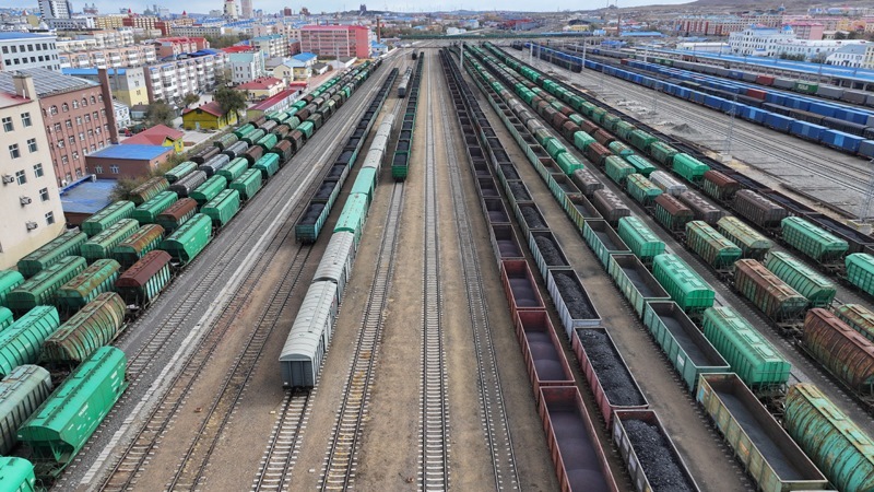 10月18日,在中國鐵路哈爾濱局集團有限公司滿洲里站編組場,中歐班列及進口貨物列車在等待取送車作業(yè)(無人機照片)。