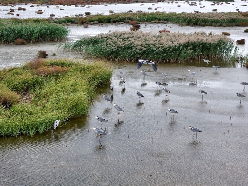 10月18日,一群候鳥在江蘇省連云港市海州灣國家級(jí)海洋公園濕地棲息、覓食(無人機(jī)照片)。