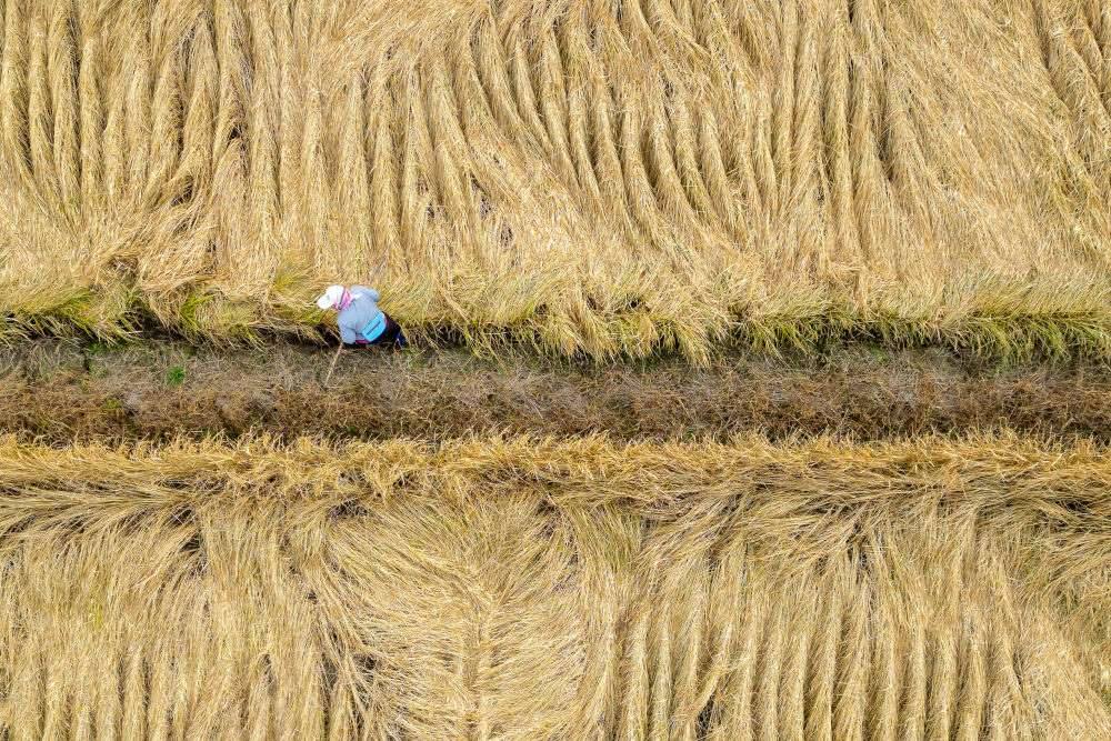 10月14日,在黑龍江省牡丹江市西安區(qū)沙虎村,村民在水稻田里忙碌(無(wú)人機(jī)照片)。新華社記者 張濤 攝