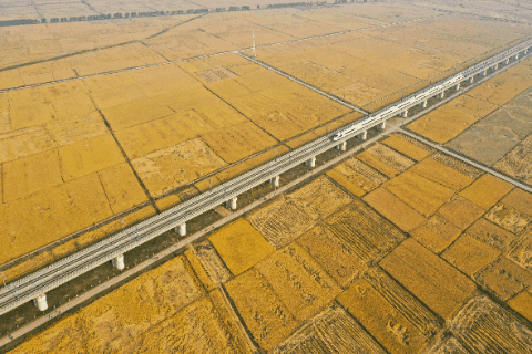 10月14日,在吉林省公主嶺市,一列高鐵列車沿著田間的鐵路線穿行(無(wú)人機(jī)照片)。2025年,吉林省深化農(nóng)機(jī)研發(fā)、制造、推廣、應(yīng)用一體化試點(diǎn)示范,農(nóng)作物耕種收綜合機(jī)械化率達(dá)94.6%。新華社記者 張楠 攝