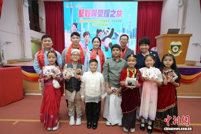 在香港油麻地街坊會(huì)學(xué)校,四川省大熊貓國(guó)家公園文化創(chuàng)意創(chuàng)新聯(lián)盟副秘書(shū)長(zhǎng)畢飛向?qū)W生們科普四川生態(tài)及大熊貓保育知識(shí)。代表團(tuán)還向?qū)W生派發(fā)文創(chuàng)貼紙,為體育與大熊貓主題書(shū)籍簽名。代表團(tuán)也和同學(xué)們一起參觀第十五屆全國(guó)運(yùn)動(dòng)會(huì)主題展板。