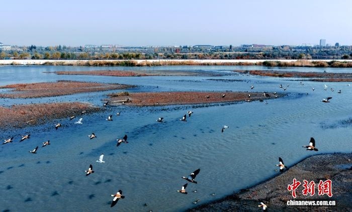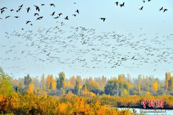中新網(wǎng)烏魯木齊10月28日電 (黨艷麗)深秋時節(jié),成群結(jié)隊的灰雁“到訪”新疆可克達(dá)拉市。它們或飛翔在湛藍(lán)的天空上,發(fā)出陣陣鳴叫聲;或集結(jié)在伊犁河可克達(dá)拉市段河畔,補(bǔ)給“能量”,為接下來的遷徙旅程做足準(zhǔn)備。