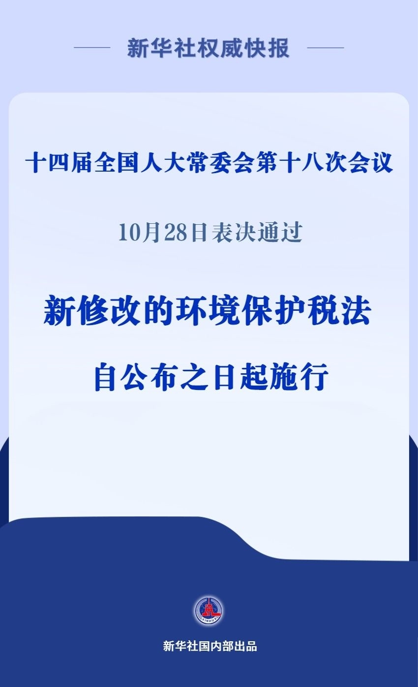 十四屆全國人大常委會第十八次會議10月28日表決通過關(guān)于修改環(huán)境保護稅法的決定,并自公布之日起施行。