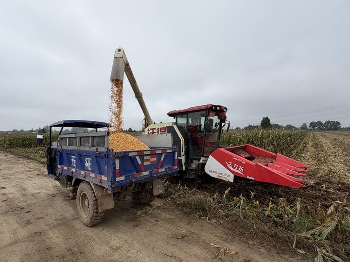 圖為一臺履帶式聯(lián)合收割機在陜西省武功縣長寧鎮(zhèn)一處糧田完成收割后將玉米倒入運糧車。新華社記者劉彤 攝