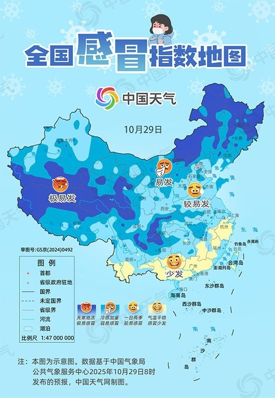 從中國天氣網(wǎng)推出的全國感冒指數(shù)地圖來看,10月29日我國北方大部屬于容易感冒的區(qū)域,10月30日至31日,隨著新一股冷空氣登場,容易感冒的區(qū)域有所增加,超15省份易引發(fā)感冒。
