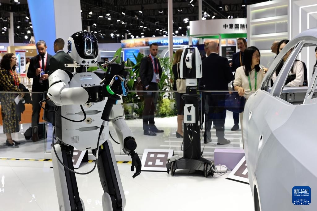 11月5日,一個(gè)海克斯康A(chǔ)EON工業(yè)人形機(jī)器人在展臺(tái)上進(jìn)行三維掃描作業(yè)演示,這也是該型號(hào)機(jī)器人工業(yè)自動(dòng)化應(yīng)用場(chǎng)景的中國(guó)首展。