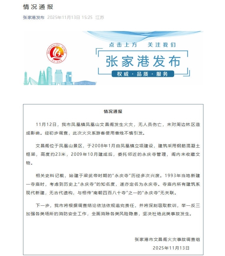 中新網(wǎng)11月13日電 據(jù)“張家港發(fā)布”微信公眾號消息,張家港市文昌閣火災(zāi)事故調(diào)查組13日發(fā)布情況通報。通報指出,11月12日,張家港市鳳凰鎮(zhèn)鳳凰山文昌閣發(fā)生火災(zāi),無人員傷亡,未對周邊林區(qū)造成影響。經(jīng)初步調(diào)查,此次火災(zāi)系游客使用香燭不慎引發(fā)。