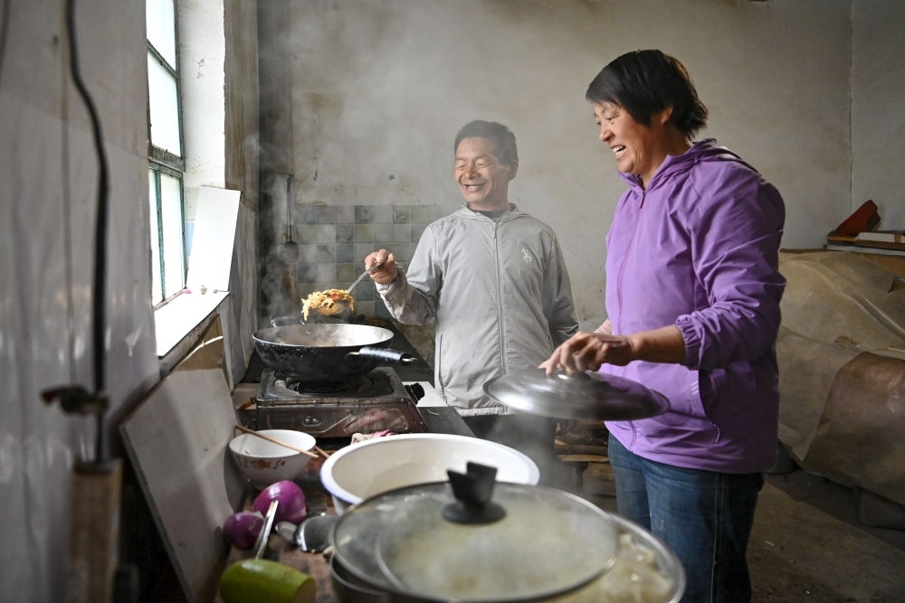 ↑村民程嬌梅(右)為秦海松準(zhǔn)備午飯(2025年10月11日攝)。