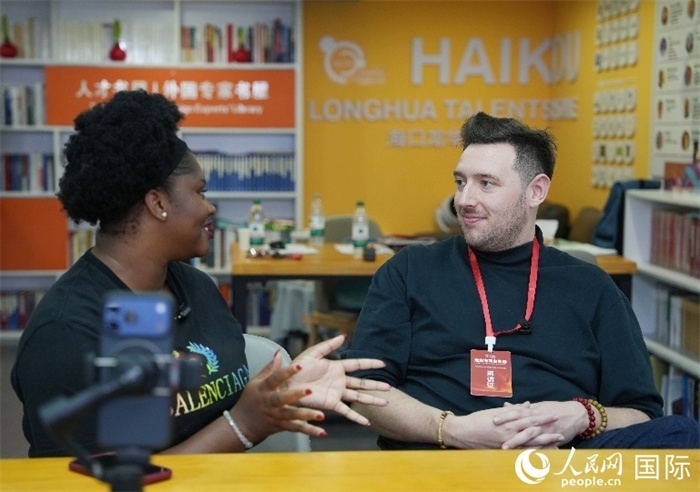 尼日利亞籍創(chuàng)業(yè)者馬爾維斯·烏福馬杜(左一)接受人民網(wǎng)外專(zhuān)柯明可采訪(fǎng)。人民網(wǎng)記者 符武平攝