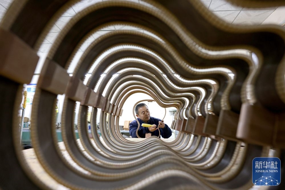 ↑ 12月15日,中鐵科工集團(tuán)武漢江夏制造基地技術(shù)工人對(duì)盾構(gòu)機(jī)配件進(jìn)行裝配作業(yè)。新華社發(fā)(趙軍攝)