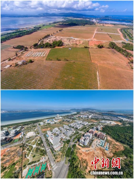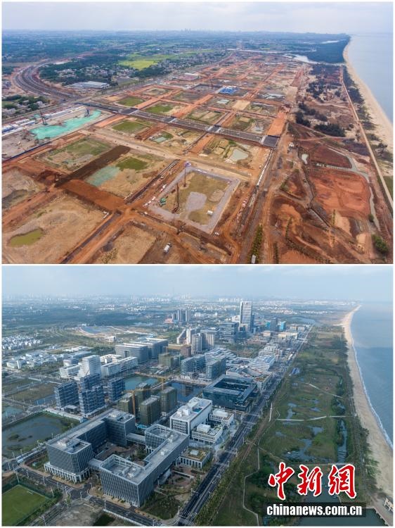 2025年12月18日,海南自由貿易港正式啟動全島封關。近年來,海南自貿港建設在利好政策帶動下不斷刷新“自貿港速度”,一個個重大項目、重點園區(qū)拔地而起,直觀呈現(xiàn)海南自貿港的蓬勃生機。這里正成為中國對外開放的新前沿、互利合作的新熱土和推動經濟全球化的新引擎。上資料圖為2020年8月19日俯瞰三亞崖州灣科技城高新區(qū)建設現(xiàn)場,下資料圖為2025年12月9日已初具規(guī)模的三亞崖州灣科技城高新區(qū)。(拼版圖,無人機照片)
