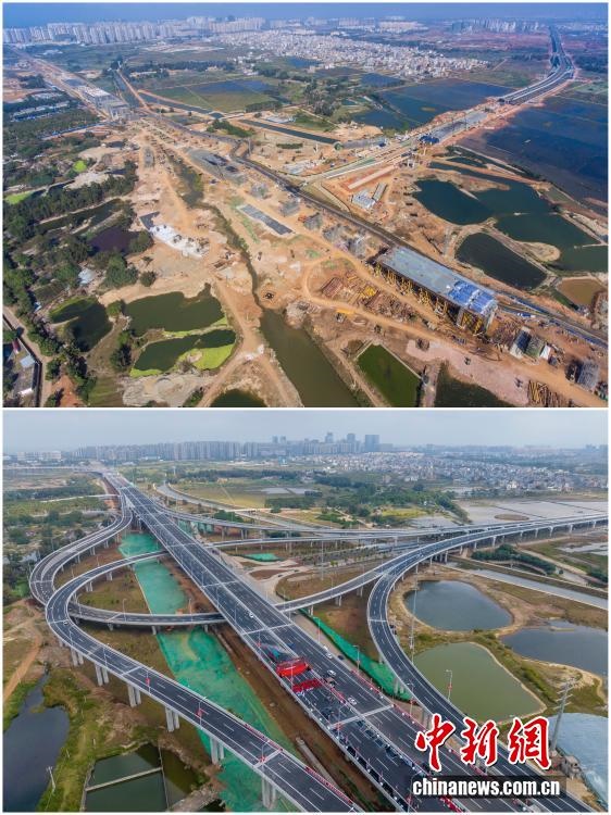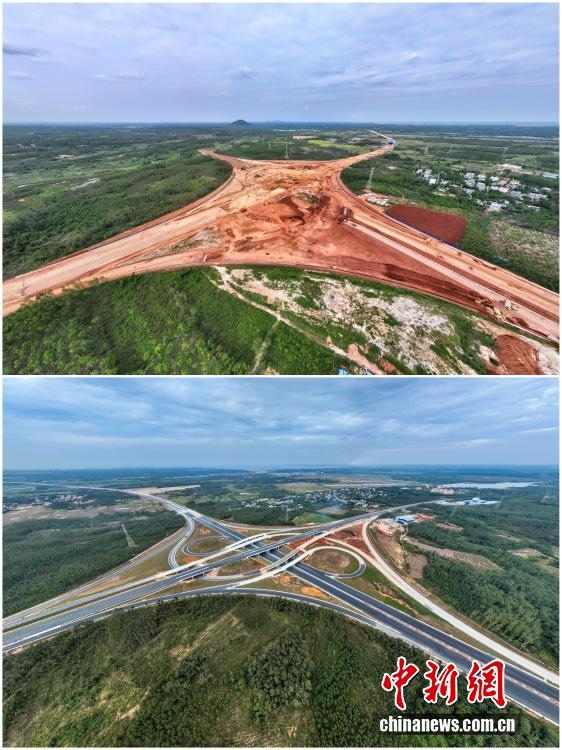 2025年12月18日,海南自由貿易港正式啟動全島封關。近年來,海南自貿港建設在利好政策帶動下不斷刷新“自貿港速度”,一個個重大項目、重點園區(qū)拔地而起,直觀呈現(xiàn)海南自貿港的蓬勃生機。這里正成為中國對外開放的新前沿、互利合作的新熱土和推動經濟全球化的新引擎。上資料圖為2021年2月6日正在建設中的G15沈海高速公路??诙雾椖亢P慊ネǎ沦Y料圖為2022年12月28日G15沈海高速公路??诙谓ǔ赏ㄜ?。(拼版圖,無人機照片)