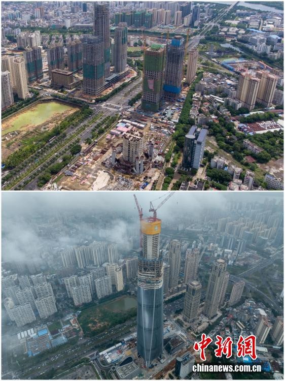 2025年12月18日,海南自由貿易港正式啟動全島封關。近年來,海南自貿港建設在利好政策帶動下不斷刷新“自貿港速度”,一個個重大項目、重點園區(qū)拔地而起,直觀呈現(xiàn)海南自貿港的蓬勃生機。這里正成為中國對外開放的新前沿、互利合作的新熱土和推動經濟全球化的新引擎。上資料圖為2020年8月21日因故停工的“海南第一高樓”海南中心項目,下資料圖為2025年12月16日海南中心項目順利完成塔樓核心筒結構封頂。(拼版圖,無人機照片)