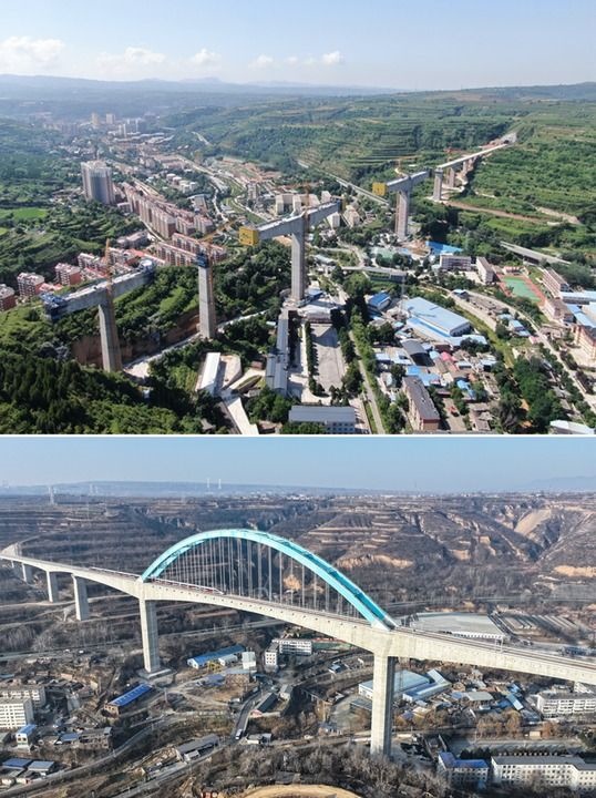 拼版照片:上圖為施工中的西延高鐵王家河特大橋(2023年7月22日攝,無人機照片);下圖為一列試運行列車從西延高鐵王家河特大橋駛過(2025年12月10日攝,無人照片)。新華社記者 張博文 攝