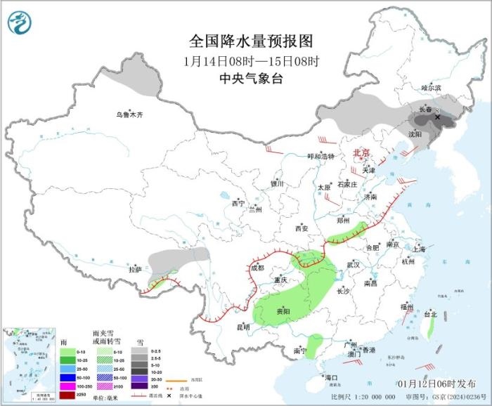 圖4 全國降水量預(yù)報(bào)圖(1月14日08時(shí)-15日08時(shí))。圖片來源:中央氣象臺網(wǎng)站