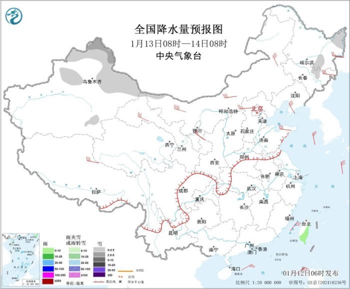 圖2 全國降水量預(yù)報(bào)圖(1月12日08時(shí)-13日08時(shí))。圖片來源:中央氣象臺網(wǎng)站