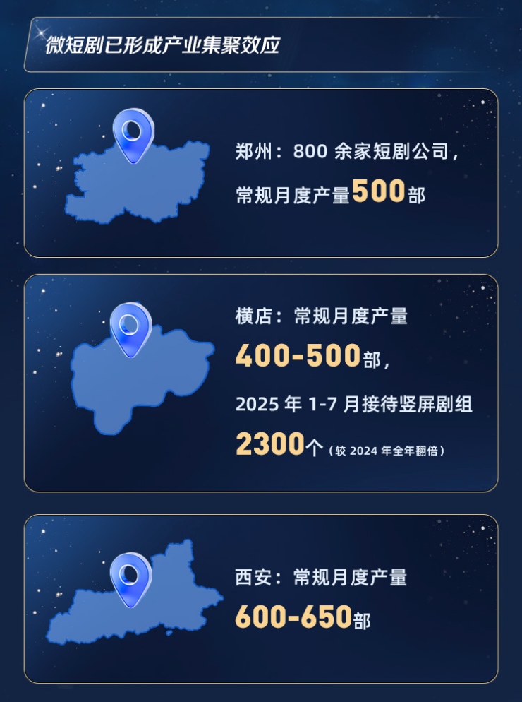 數(shù)據(jù)顯示,全國短劇月度產(chǎn)量已穩(wěn)定在約3000部,并在區(qū)域分工趨勢下,帶動就業(yè)從一線城市向中西部擴散。鄭州、西安、橫店等地,正成為這一產(chǎn)業(yè)地理格局的重要支點。