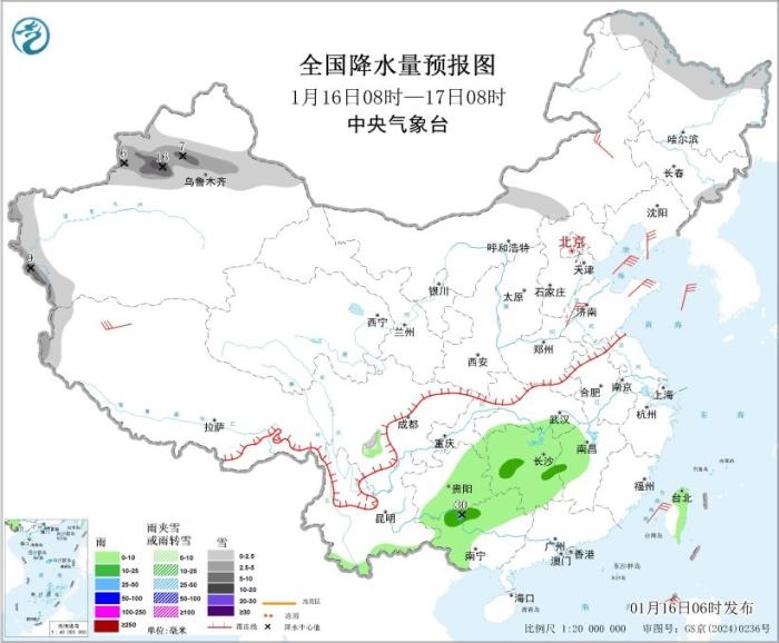 1月16日08時(shí)至17日08時(shí),新疆沿天山地區(qū)及南疆西部山區(qū),黑龍江北部、吉林東部、西藏西部等地部分地區(qū)有小到中雪,其中,新疆沿天山西部地區(qū)和伊犁河谷等地部分地區(qū)有大到暴雪(10~16毫米);江南中西部、貴州東部和南部、廣西西部和北部、云南南部、臺(tái)灣島東部等地部分地區(qū)有小到中雨,廣西西北部局地有大雨(25~30毫米)。內(nèi)蒙古中東部、華北北部、黃淮中東部、遼寧南部、西藏中西部等地部分地區(qū)有4~6級(jí)風(fēng);渤海、渤海海峽、黃海北部和中部有5~7級(jí)風(fēng)、陣風(fēng)8級(jí)(見(jiàn)圖1)。