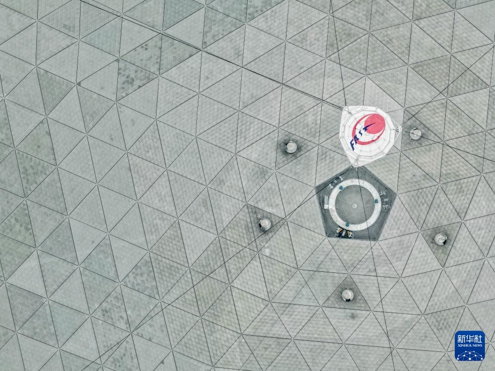 1月16日拍攝的“中國天眼”饋源艙(無人機照片,維護(hù)保養(yǎng)期間拍攝)。