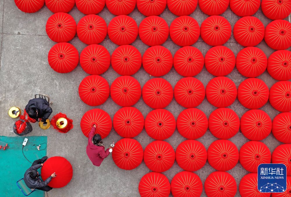 ↑ 1月21日,在浙江省臺州市仙居縣橫溪鎮(zhèn)一家燈籠加工作坊,工人趕制大紅燈籠(無人機照片)。新華社發(fā)(王華斌攝)