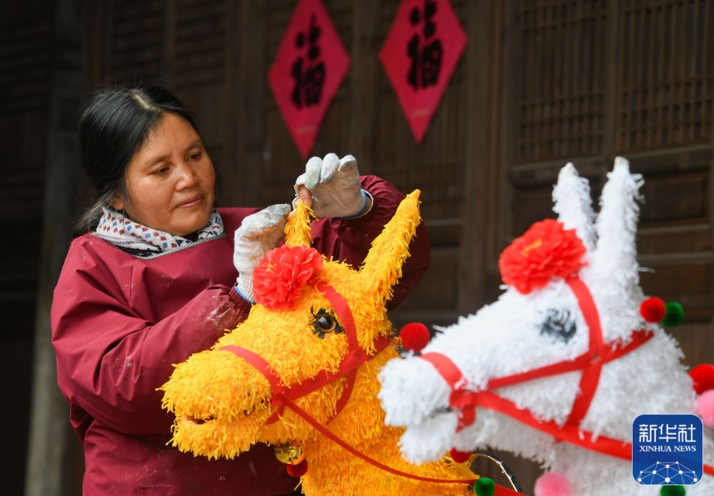 ↑ 1月21日,浙江省金華市浦江縣檀溪鎮(zhèn)潘周家村一古廳堂內(nèi),村民在制作擂馬燈。新華社發(fā)(時寬兵攝)
