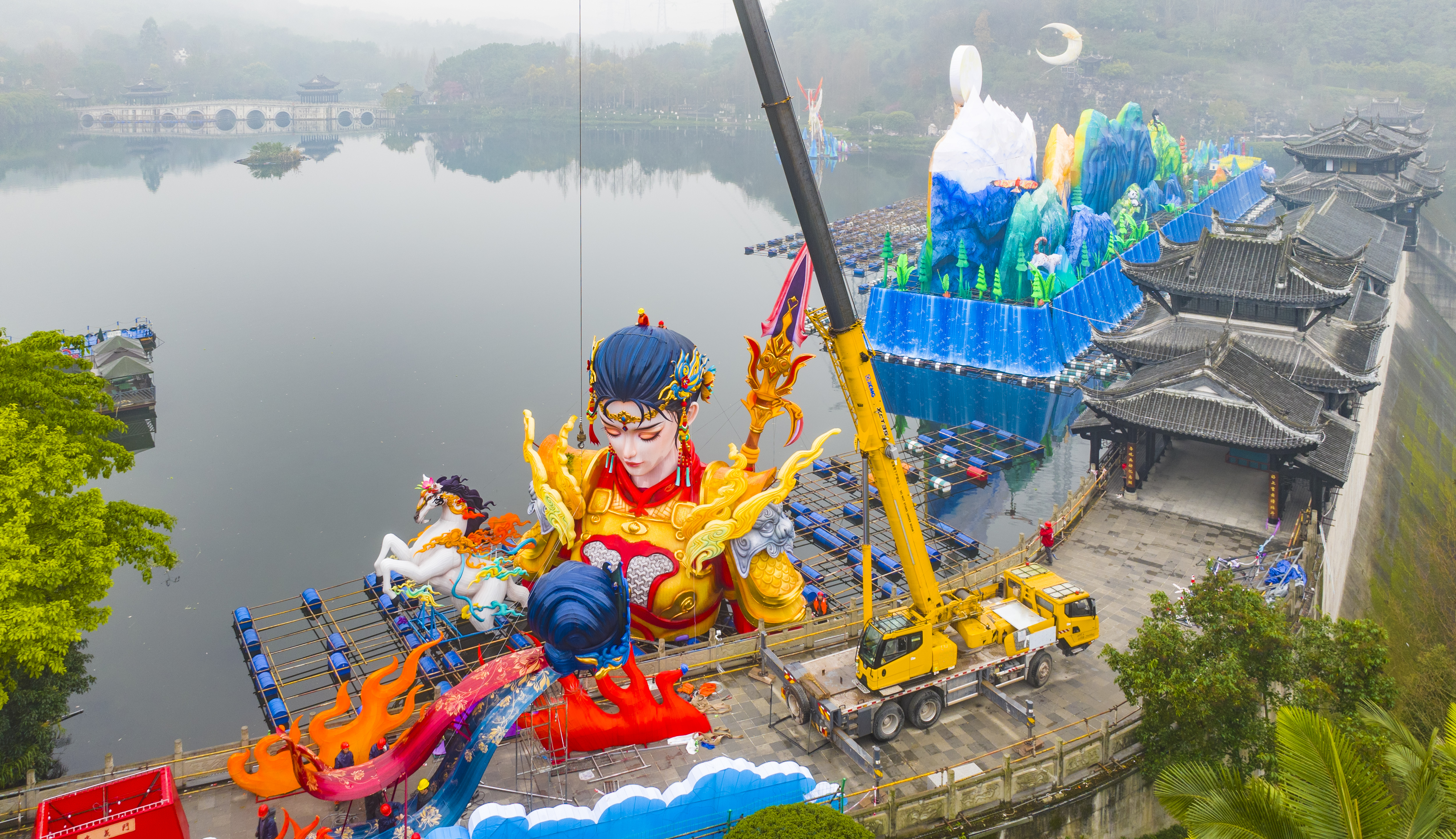 ▲2026重慶市新春燈會(huì)——“禧歡霓”園博園大型水上燈會(huì),工人們正在抓緊搭建《巾幗良玉》燈組。記者 齊嵐森 攝/視覺重慶