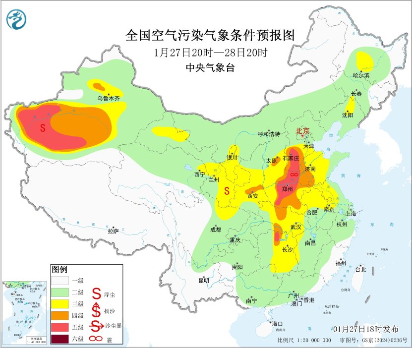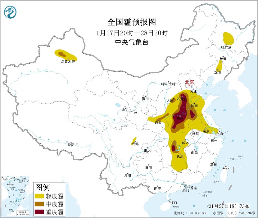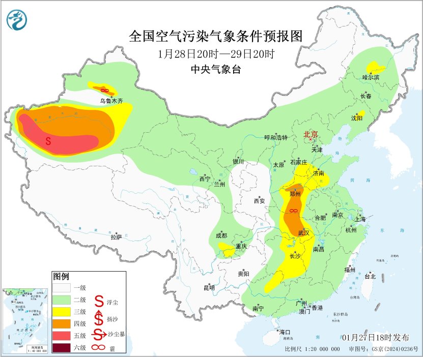27日夜間至29日,湖北中東部、湖南中北部等地大氣擴散條件一般,有輕至中度霾。此外,27日夜間至28日上午,湖北中東部、湖南北部等地的部分地區(qū)有大霧,局地有能見度不足200米的強濃霧。