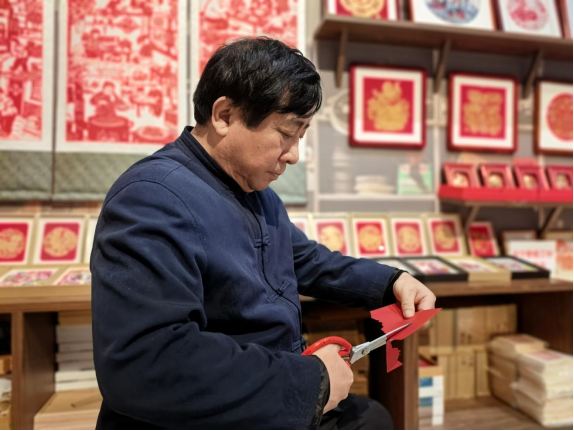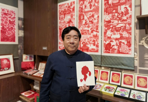 工坊中央,克樹利被層層觀眾圍住,叫好聲此起彼伏。只見他手持一張巴掌大的紅紙,目光在人群中一掃,隨手拉住前排一位扎馬尾辮的小姑娘,手上的剪刀便如游龍般翻飛起來。不畫底稿、不做標(biāo)記,紅紙在他手中旋轉(zhuǎn)變形,幾十秒的工夫,一把剪刀開合之間,一張惟妙惟肖的人影剪紙便已成型——俏皮的馬尾辮、抿著嘴的笑臉,甚至連小姑娘頭頂上的發(fā)卡都清晰可見?!跋?!太像了!”圍觀人群中爆發(fā)出一陣熱烈的掌聲,小姑娘捧著剪紙,喜笑顏開。