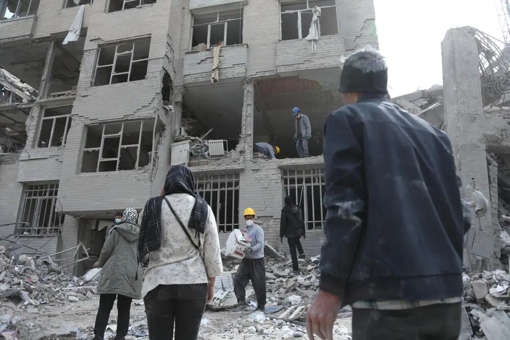 3月12日,在伊朗首都德黑蘭,市民站在建筑廢墟前。新華社記者 沙達提 攝