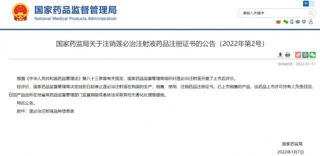 據(jù)國家藥監(jiān)局網(wǎng)站消息,國家藥品監(jiān)督管理局11日發(fā)布公告,決定自即日起停止蓮必治注射液在我國的生產(chǎn)、銷售、使用,注銷藥品注冊證書。已上市銷售的產(chǎn)品,由藥品上市許可持有人負責召回,召回產(chǎn)品由所在地省級藥品監(jiān)督管理部門監(jiān)督銷毀或者依法采取其他無害化處理等措施。