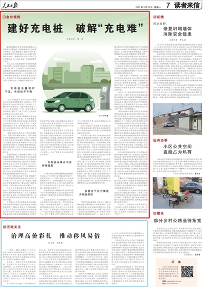 今年3月20日,《人民日?qǐng)?bào)》讀者來(lái)信版“金臺(tái)視線”欄目《建好充電樁 破解“充電難”》一文,在消費(fèi)者個(gè)人安裝新能源汽車充電樁方面,關(guān)注了多位“人民投訴”平臺(tái)用戶吐槽“物業(yè)不配合業(yè)主安裝充電樁以及個(gè)人充電樁的維護(hù)管理不到位”等問(wèn)題。