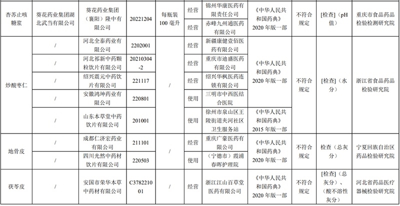 經(jīng)寧夏回族自治區(qū)藥品檢驗(yàn)研究院檢驗(yàn),標(biāo)示為成都仁濟(jì)宏藥業(yè)有限公司、四川光然中藥材飲片有限公司生產(chǎn)的2批次地骨皮不符合規(guī)定,不符合規(guī)定項(xiàng)目為總灰分。