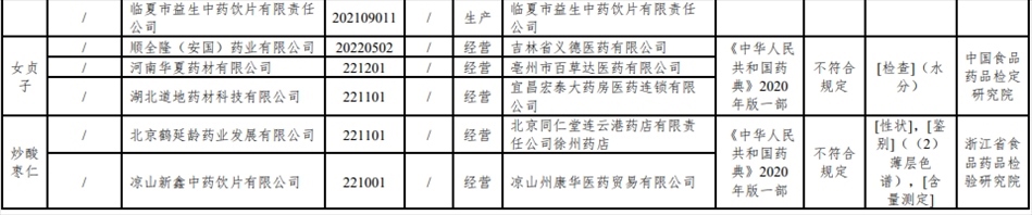 經(jīng)浙江省食品藥品檢驗研究院檢驗,標示為北京鶴延齡藥業(yè)發(fā)展有限公司、涼山新鑫中藥飲片有限公司生產(chǎn)的2批次炒酸棗仁不符合規(guī)定,不符合規(guī)定項目包括性狀、鑒別、含量測定。