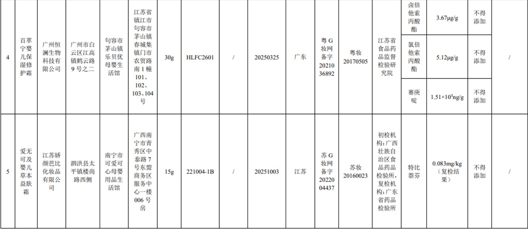 記者注意到,這6批次化妝品中還出現(xiàn)了嬰童用品。其中,產(chǎn)品標簽標示為廣州恒瀾生物科技有限公司生產(chǎn)的百萃寧嬰兒保濕修護霜檢出不得添加的鹵倍他索丙酸酯、氯倍他索丙酸酯、賽庚啶。