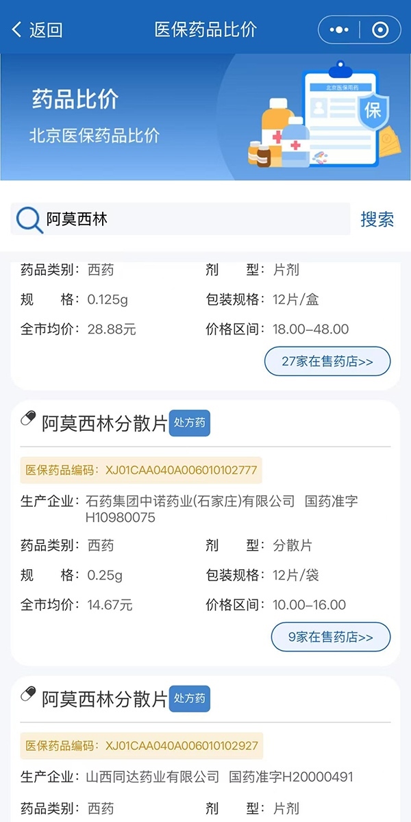 第四步:以搜索阿莫西林為例,可以看到下方展示了在售的相關商品及價格等信息。