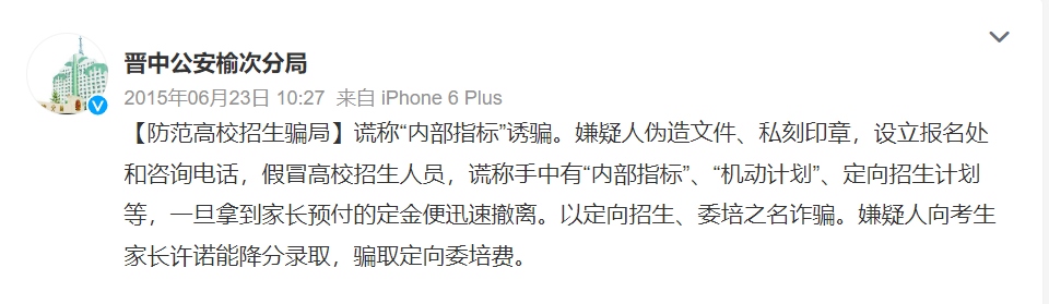 每年各省市投檔分?jǐn)?shù)線公布后,總是“幾家歡喜幾家愁”,不法分子也在此刻瞄準(zhǔn)了落榜考生。根據(jù)各地公安部門通報,一些不法分子假冒高校招生人員或聲稱“熟悉”高校招生辦,點對點與相關(guān)考生取得聯(lián)系。隨后謊稱有某高校的“內(nèi)部指標(biāo)”“機(jī)動計劃”,或是以“定向招生”“委培招生”等名義“降分錄取”考生,誘騙其繳納相關(guān)費(fèi)用。需要注意的是,在實施這些詐騙行為時,不法分子往往使用電腦合成技術(shù)偽造“招生文件”“學(xué)校公章”等,騙取考生及家長的信任。