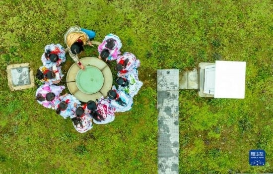 3月23日,學(xué)生在貴州省黔西市氣象局綜合氣象觀測(cè)站觀看大型蒸發(fā)皿(無(wú)人機(jī)照片)。
