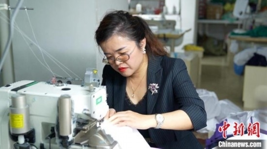 圖為李王花上機(jī)操作縫紉服裝。 陳英清 攝