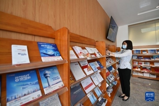 5月18日,工作人員在天開(kāi)高教科創(chuàng)園內(nèi)的“金融超市”整理宣傳冊(cè)。