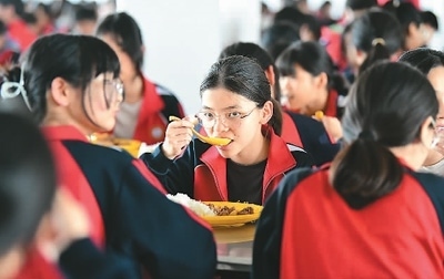 近年來,安徽省阜陽(yáng)市阜南縣各配備有營(yíng)養(yǎng)餐的學(xué)校嚴(yán)把食品衛(wèi)生關(guān),讓學(xué)生的營(yíng)養(yǎng)餐真正成為陽(yáng)光餐、幸福餐。圖為5月17日,阜南縣黃崗鎮(zhèn)靳成學(xué)校的學(xué)生們?cè)谑程贸晕顼垺?呂乃明攝(人民視覺)