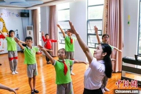 榮獲“廣東好人”稱號(hào)的姚蘊(yùn)儀11日在廣東汕頭市潮南區(qū)特殊教育學(xué)校教聽(tīng)障孩子練習(xí)舞蹈。鐘欣 攝