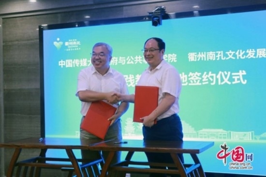 隨后,中國傳媒大學實習實踐教學基地合作協(xié)議簽約儀式在中國儒學館四樓舉行。中國傳媒大學政府與公共事務學院副院長白文剛;市文化廣電旅游局黨委副書記、副局長程玲出席會議并致辭,市文旅局黨委委員、南孔文化發(fā)展中心主任盛雄生參加。