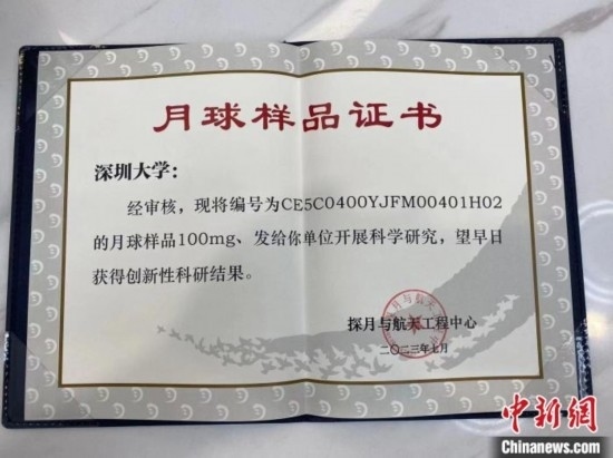 月球樣品證書。深圳大學供圖