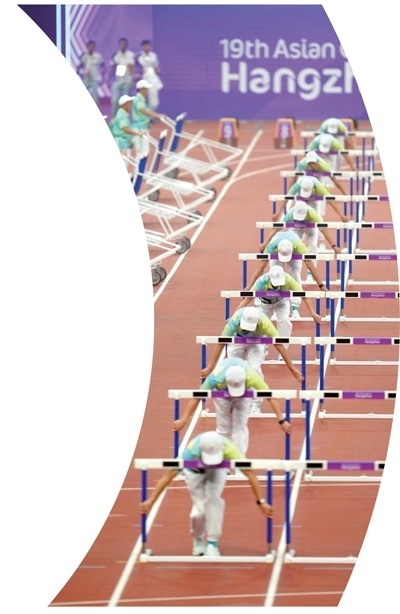 杭州奧體中心體育場內(nèi),志愿者在田徑項目女子七項全能100米欄比賽前準(zhǔn)備場地。 新華社記者 江文耀攝