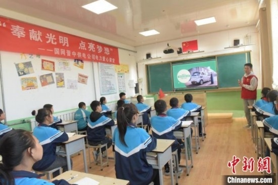 在國家電網(wǎng)“電力愛心教室”內,電力人員為鄉(xiāng)村兒童科普電力知識。展望攝