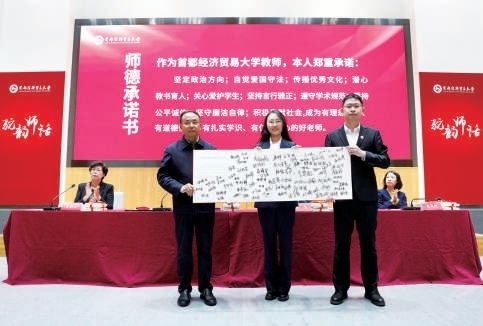 在加強(qiáng)思想政治建設(shè)方面,抓好思政課改革創(chuàng)新,在市屬高校率先全面開(kāi)設(shè)“習(xí)近平新時(shí)代中國(guó)特色社會(huì)主義思想概論”課,獲批北京市首批重點(diǎn)建設(shè)馬克思主義學(xué)院。持續(xù)開(kāi)展課程思政建設(shè),得到市委教育工委的肯定性評(píng)價(jià)。聯(lián)動(dòng)社會(huì)大課堂,成立大學(xué)生思想政治教育中心,與北大紅樓、中國(guó)人民抗日戰(zhàn)爭(zhēng)紀(jì)念館、長(zhǎng)辛店二七紀(jì)念館等單位共建一批“大思政課”實(shí)踐教學(xué)基地。堅(jiān)持“五育并舉”,促進(jìn)學(xué)生全面發(fā)展。五年多來(lái),學(xué)校獲評(píng)多項(xiàng)教育部和北京市課程思政建設(shè)獎(jiǎng)項(xiàng)、北京高?!叭恕眱?yōu)秀成果、北京高?!笆演o導(dǎo)員”等榮譽(yù)。一批學(xué)生在文體比賽中獲省部級(jí)及以上獎(jiǎng)勵(lì),展現(xiàn)出新時(shí)代首經(jīng)貿(mào)學(xué)子的良好風(fēng)貌。