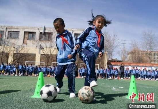 圖為在西寧市大堡子小學,學生進行足球特色大課間展示。馬銘言 攝